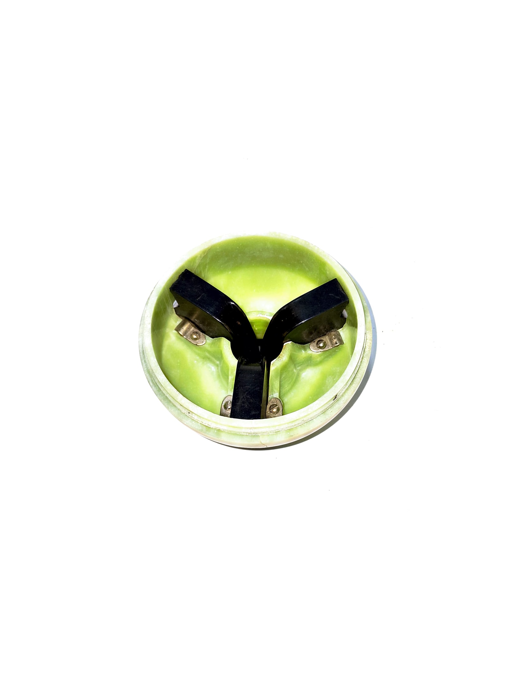 Near-spherical ashtray, translucent green marbled urea formaldehyde on a black Bakelite base base. From the top section three hinged cigarette rests can be folded outwards. The base is flat and is weighted inside so the ashtray can stand.