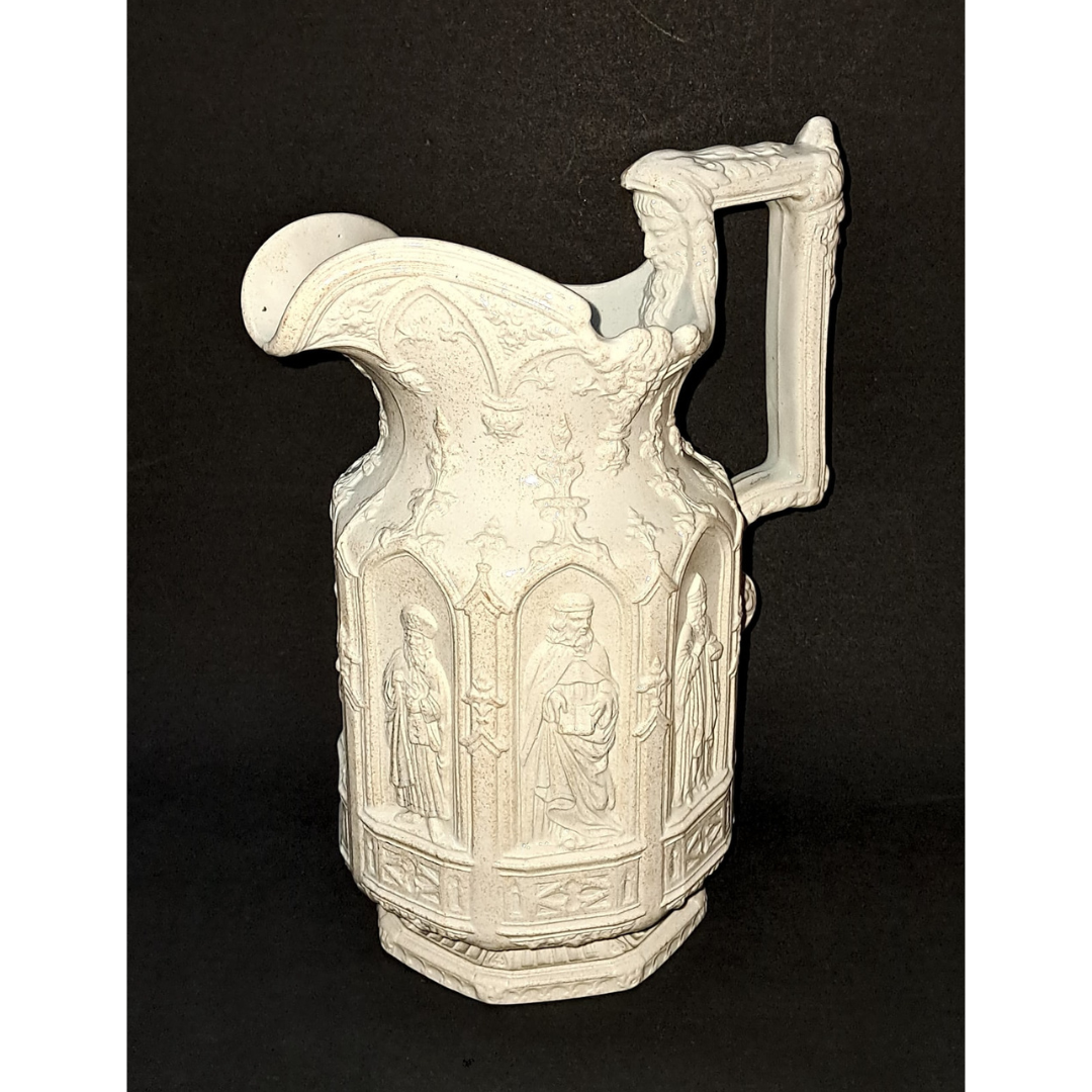 • Antique large “Victorian ecclesiastical Gothic Apostle ceramic jug“. A beautiful as relief jug/pitcher featuring a religious theme with “Apostle”. Made in England. Heavily decorated with deep molded figures of 8 of the 12 Apostles. Decorated with Gothic architectural elements and gargoyles.